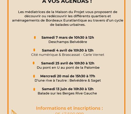 Les médiatrices de la Maison du Projet Bordeaux Euratlantique vous proposent de découvrir les actualités des quartiers au cours de balades urbaines à travers…