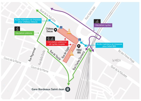 - Les accès piétons à l’hôtel IBIS et au château DESCAS seront maintenus en impasse sur Paludate pendant la durée des travaux.